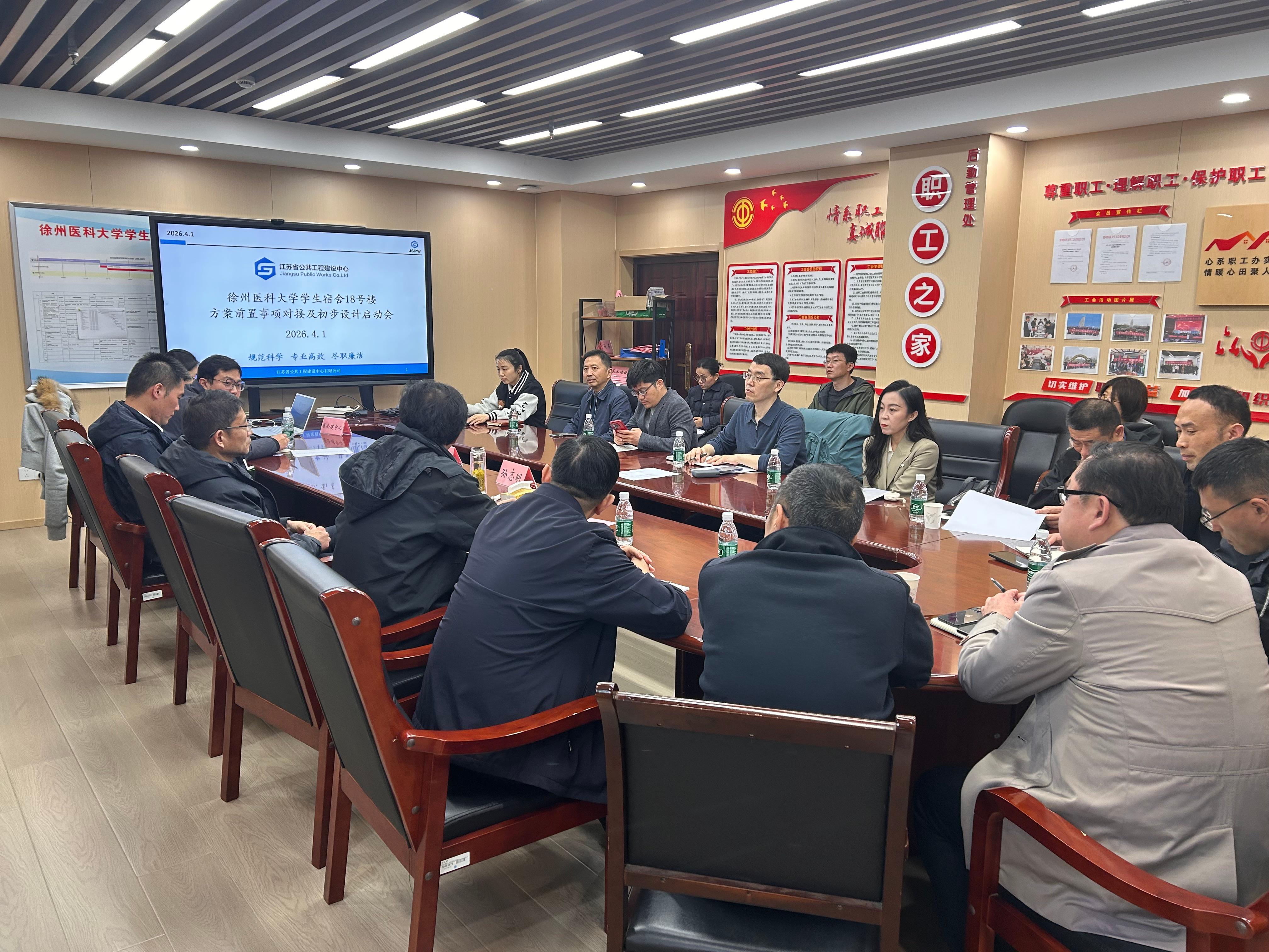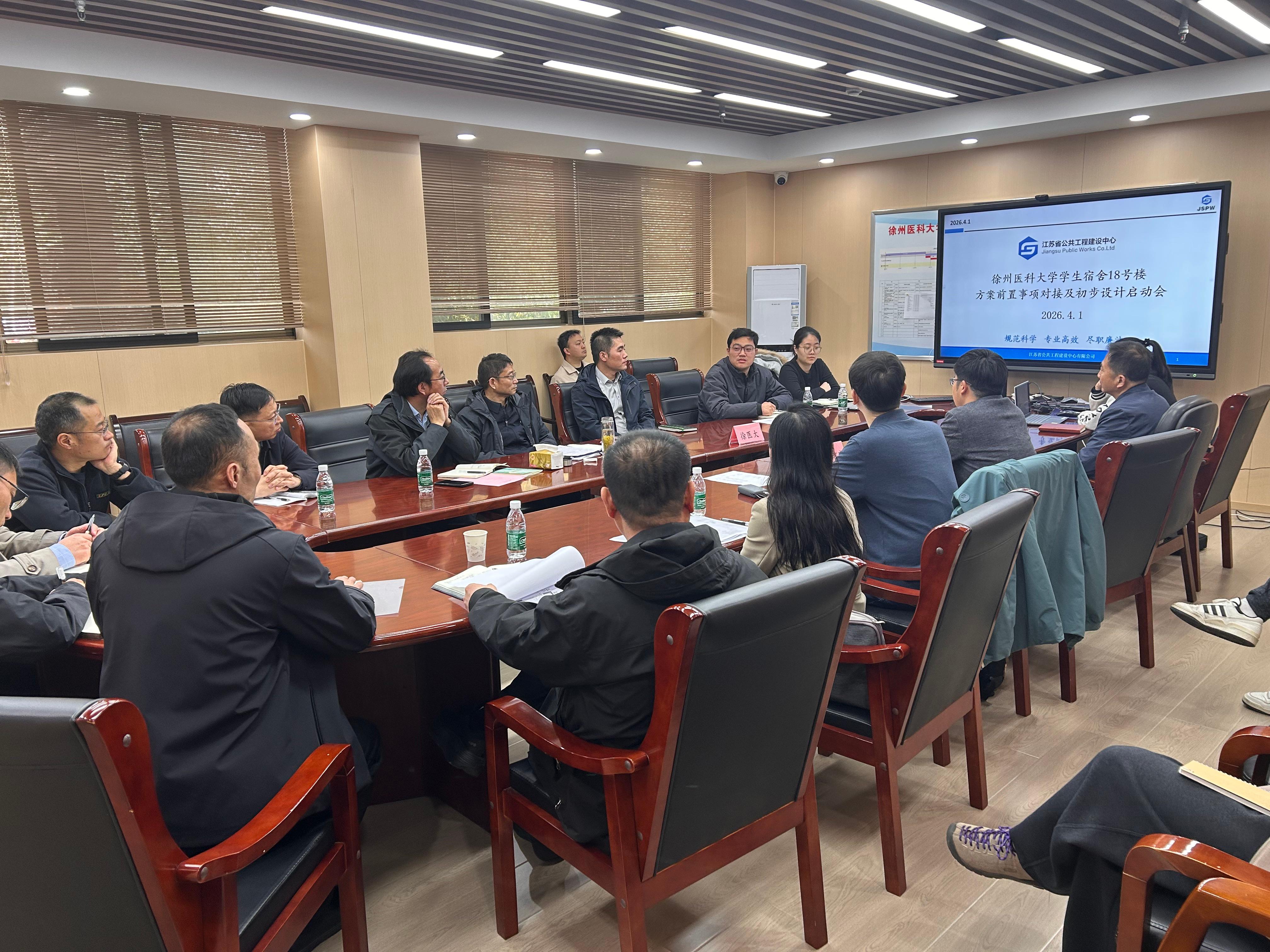 为有序推进学生宿舍18号楼建设项目,优化学生住宿环境,夯实办学保障基础,2026年4月1日上午,我校学生宿舍18号楼方案初步设计启动会在培训中心一楼会议室召开。学校党委常委、副校长孙志明,江苏省公共工程建设中心、长江都市设计公司、原土设计公司及学校相关部门负责人共同参会。